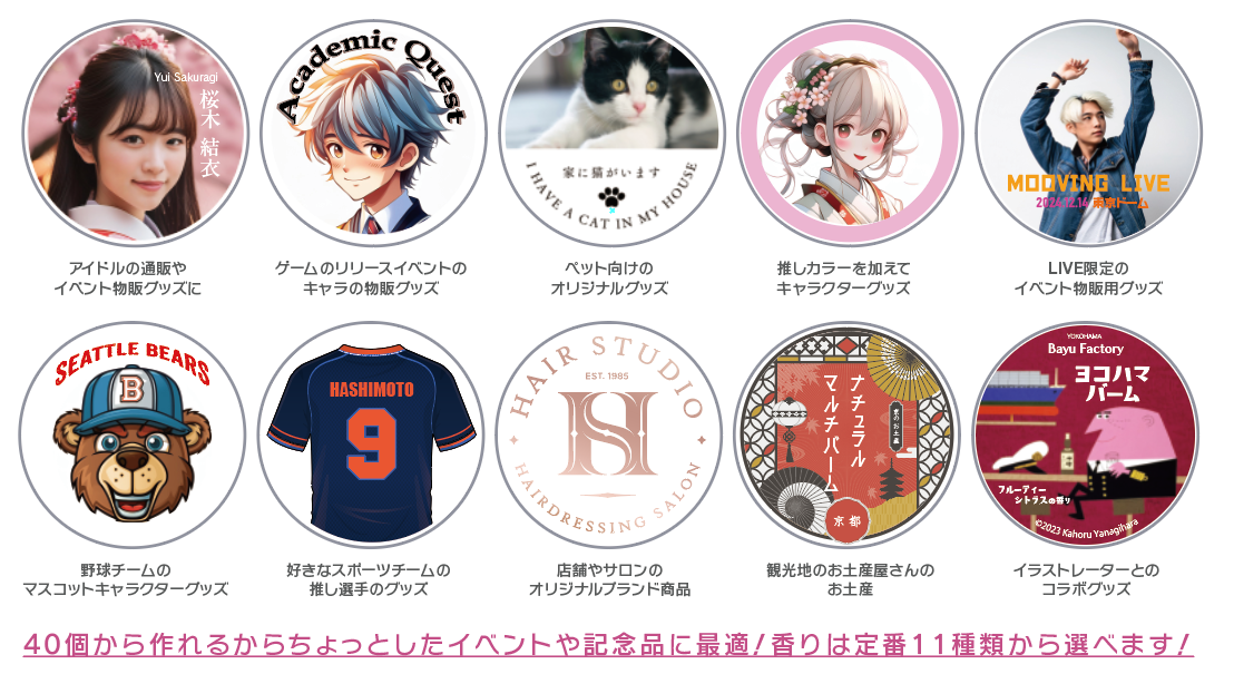 推し活応援 オリジナルデザインでの生産は小ロット40個から対応可能!オーダーメイドで香りを作ることもできます‼ キャラクターやタレントグッズの物販や通販にも!香りもデザインも自由自在なマルチバームを是非!お問い合わせやオーダーは公式LINEが便利です‼ お問い合わせ用公式LINE 専用の公式LINEにご登録頂きましたら、お問い合わせ、ご相談、オーダーまで公式LINEで完結しますので、ぜひご登録お願いいたします。 公式LINEご登録URL